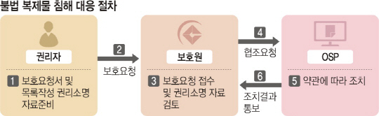 ‘민관 협력 대응 조치’는 권리자가 보호원에 저작물에 대한 보호 요청을 하면 불법 복제물 유통을 조사하고, 침해 발생 시 해당 온라인서비스 제공자에게 불법 복제물을 삭제·전송 중단하도록 침해 사실을 통지하는 절차다. 저작권 보호 심의위를 거치는 기존 시정권고의 경우 조치까지 평균 2주가 소요됐다면 민관 협력 대응 조치는 평균 2일 이내가 소요된다. 저작물에 대한 권리를 보유하고 있다면 보호원 홈페이지(www.kcopa.or.kr)를 통해 간단하게 보호 요청을 등록·접수할 수 있다. 먼저 보호원 홈페이지에 ‘권리자’로 회원 가입하고, 보호요청서와 권리 소명자료를 등록·접수한 뒤 보호요청·처리현황을 확인하면 된다.