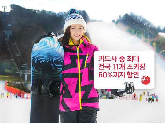 BC카드는 전국 11개 스키장서 최대 60%까지 할인 혜택을 제공하는 ‘겨울엔BC’ 이벤트를 마련한다. 내년 2월 말까지 비발디파크, 용평리조트, 휘닉스파크 등 전국 11개 스키장에서 리프트권·렌털권 등 구매 시 최대 60%까지 할인 혜택을 준다.