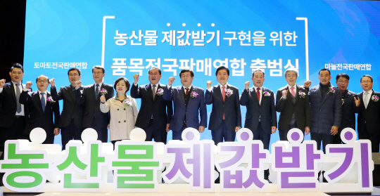 20일 서울 중구 농협중앙회에서 열린 ‘농산물 제값 받기 구현을 위한 품목전국판매연합 출범식’에서 김병원(오른쪽 여섯 번째) 농협중앙회장 등 참석자들이 파이팅을 외치고 있다. 품목전국판매연합은 특정 품목에 대해 산지 농가와 농협 중심의 조직화를 통해 생산부터 판매까지 책임지는 연합 조직이다.