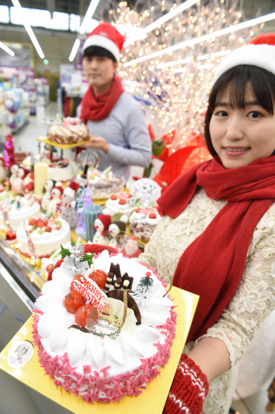 크리스마스와 연말연시를 맞아 ‘우리 쌀 소비 촉진 쌀케이크’행사를 진행 중인 서울 서초구 농협하나로마트 양재점에서 21일 모델들이 우리 쌀 케이크를 선보이고 있다.