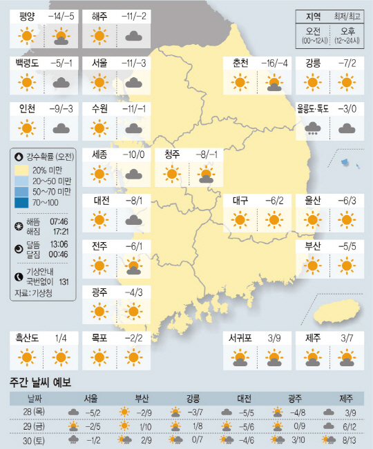 전국이 대체로 맑겠다. 아침 최저기온은 영하 17도에서 영하 2도, 낮 최고기온은 영하 5도에서 영상 6도가 되겠다.