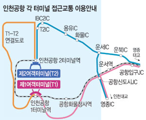 버스는 대부분 1터미널을 거쳐 2터미널에 도착한다. 다만, KAL 리무진과 한국도심공항 출발 8개 노선은 2터미널을 경유해 1터미널로 간다. 버스요금은 1, 2터미널 모두 같다. 공항철도는 모두 1터미널을 거쳐 2터미널에 도착한다. 편도 기준 2터미널 요금이 600원 더 비싸다. 두 구간 사이는 5.8㎞로 1터미널에서 내릴 때보다 6분 정도 더 걸린다.