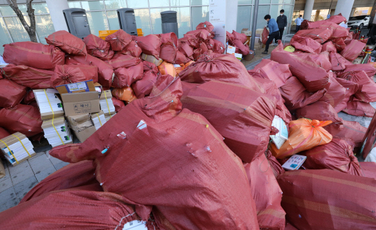 연말연시를 앞둔 26일 정부세종청사에서 관계자들이 교육부에서 수거한 각종 문서와 서류, 책자 등을 파쇄하기 위해 차량 앞에 쌓아놓고 있다.
