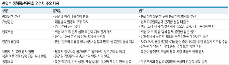 5·24 대북제재 조치와 금강산 관광 중단 등에 따른 민간 교류협력 중단도 문제로 평가했다. 정책혁신위는 “5·24 조치가 소기의 성과를 거두지 못하고 시일이 상당히 지남에 따라 실효성이 심각하게 의심받는 상황에서 국민적 정서 등을 내세워 제재 조치 해제에 미온적 입장을 유지했다”고 비판했다. 그러면서 북측은 금강산 관광 재개에 적극적인 의사를 보였으나, 우리 정부가 ‘진상규명’‘재발방지’ ‘신변안전 대책’ 등 3대 전제조건을 요구해 접점이 이뤄지지 않았다는 평가와 함께 “남한 정부는 관광사업 재개에 소극적이었다”고 밝혔다. 태영호 전 영국주재 북한공사의 망명과 북한 해외식당 종업원 집단 탈북과 관련한 통일부의 발표도 비판했다. 그동안 정부가 탈북 관련 사안을 공개적으로 발표하지 않은 관례에 어긋난다는 것이다. 특히 발표 시점이 총선 또는 한미연합군사훈련 등과 맞물린다는 점을 근거로 “정치적 목적으로 무리하게 발표했다”고 지적했다. 또 통일 교육이 지나치게 안보 교육을 강조해 균형성을 잃었다고 결론 내렸다.
