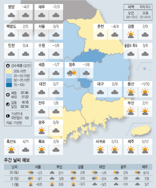 강원 영서, 충북 북부, 경북 북부내륙에는 새벽부터 아침 사이 눈 또는 비가 조금 오겠다. 아침 최저기온은 영하 5도에서 영상 3도, 낮 최고기온은 영상 3도에서 12도가 되겠다.