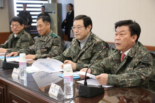 대통령직속 일자리위원회의 이용섭(사진 오른쪽 두 번째) 부위원장과 박성택(〃첫 번째) 중소기업중앙회 회장, 임채운(〃네 번째) 중소기업진흥공단 이사장은 27일 경기 양주시 육군 26사단을 방문, 최진규 사단장(〃세 번째)에게 장병들의 진로문제 해결을 위한 정책 수립을 약속했다. 육군 26사단은 중소기업 일자리위원회(공동위원장 박성택 등)와 육군이 공동수행하는 ‘청년장병 진로취업 도움사업’ 시범사업 부대 중 하나다. 전역예정 장병들에게 6개월간 민간 취업 전문컨설턴트의 교육·컨설팅을 제공하고, 전역 후 중소벤처기업에 취업을 연계해준다.