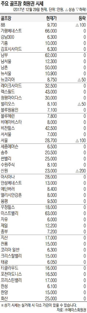 회원권시장의 상승세가 이어지고 있다. 지난주보다 상승폭이 약화되는 양상이나 상대적으로 관심이 식을 수도 있는 연말인 점을 감안하면 양호한 흐름이라는 평이다. 초고가권은 이스트밸리의 상승세가 주춤하나 렉스필드가 강보합이고 비에이비스타 무기명회원권이 상승 중이다. 고가권은 송추가 고점 하락에서 보합으로 시세가 개선 중이고 서울회원권은 적절한 매물이 없어 상승세가 지속됐다. 중가권은 88이 매수세가 강화되면서 상승에 성공했고, 그린힐, 발안, 레이크우드까지 상승세를 시현하면서 온기가 전해지고 있다.