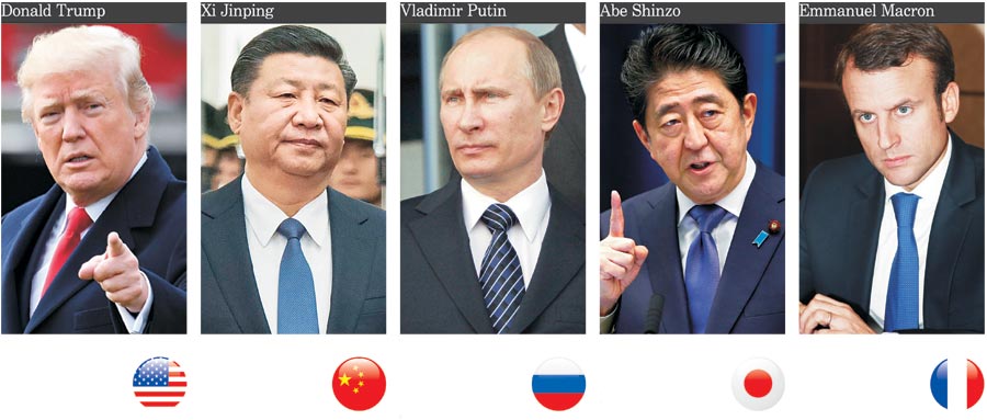 여기에 연립정부 구성 지지부진으로 힘이 빠진 앙겔라 메르켈 독일 총리의 빈자리를 메우면서 국제사회 현안마다 목소리를 높이고 있는 프랑스의 신예 에마뉘엘 마크롱 대통령의 비상도 만만치 않다. 아베 신조(安倍晋三) 총리 역시 일본의 부활을 외치면서 군사력 강화를 노리고 있다. 모두가 국익을 위해서라면 한 치도 물러서지 않는 ‘스트롱 맨’이다. 새해 업무를 여는 2일 올 한 해 숨 가쁘게 전개될 국내외 무대에서 글로벌 지도자들 앞에 놓인 과제와 현안이 무엇인지 중점 조명해본다.