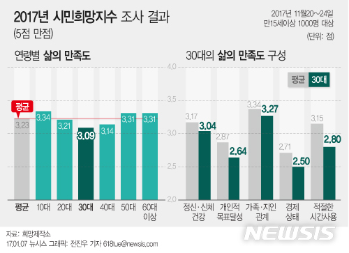 한국사회에서 30대가 전 연령대 중 가장 비관적인 세대인 것으로 조사됐다. 비영리 민간연구소 희망제작소가 지난해 11월20일부터 24일까지 전국 만 15세 남녀 1000명을 대상으로 실시한 ‘2017 시민희망인식조사’ 결과다.