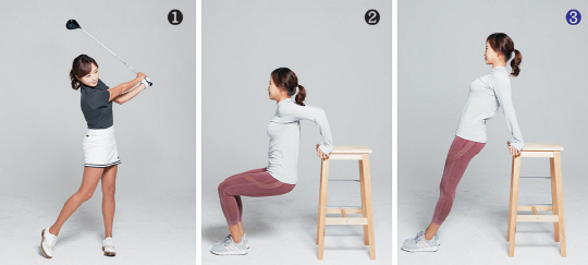 팔굽혀펴기와 같은 동작도 도움이 되지만 힘이 약한 여성 골퍼들은 팔굽혀펴기가 어렵기에 이 동작을 따라 하는 게 좋다. 먼저 사진 2, 3처럼 의자를 이용한다. 의자는 물론 소파 등 단단하고 안정적인 물체가 있으면 어디서든 할 수 있다. 운동 방법은 의자를 등지게 두고 양손을 어깨너비 정도로 잡는다. 몸은 사선이 되게 비스듬히 기울인 다음, 팔을 접으면서 아래로 내려갔다가 다시 올라온다. 이때 주의할 점은 내려갔을 때 어깨가 위로 올라오지 않아야 한다는 것이다. 아래로 내려가는 동작에서 어깨가 올라간다는 건 팔의 힘이 약하기 때문이다. 어깨와 팔의 근력이 강해지도록 이 동작을 10∼15회 정도 반복하고 점점 횟수를 늘리는 게 바람직스럽다.