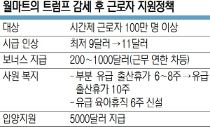 이 회사는 정규직 직원들에게 10주간 유급 출산휴가, 6주간 유급 육아휴직 등을 제공키로 했다. 이전에는 육아휴직 제도 자체가 없었고 6∼8주간 부분 유급 출산휴가 제도만 운영했다. 또 아이를 입양하는 직원에게는 5000 달러를 지급하기로 했다. 더그 맥밀런 월마트 CEO는 “감세는 글로벌 경쟁력을 강화하고 미국을 위한 계획을 가속할 기회를 제공하고 있다”고 말했다.