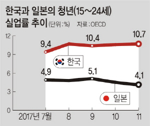 반면, 일본은 지난해 7월 15~24세 청년실업률이 4.9%였지만 11월 4.1%까지 빠르게 내려왔다. 일본은 특히 한국의 제조업 경쟁국으로 한국과 극명하게 대비되고 있다. OECD 자료를 연간으로 비교했을 때도 한국은 지난 2013년 청년실업률이 9.3%에서 최근 11%대에 근접했는데, 일본은 2013년 6.8%에서 최근 4% 초반까지 꾸준히 떨어졌다.