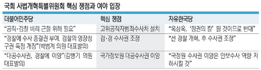 반면 한국당은 수사권 조정 필요성에는 공감하면서도 ‘선(先) 경찰 개혁, 후(後) 수사권 조정’ 원칙을 고수하고 있다. 사개특위 산하 ‘법원·법조·경찰 개혁 소위원회’ 위원장을 맡은 여상규 한국당 의원은 “지금은 행정경찰과 수사경찰이 혼재돼 있고 자치경찰제도 시행되지 않고 있는데, 이런 상황에서 수사권 독립이 되면 또 다른 부작용을 낳을 수 있는 만큼 경찰 조직에 대한 개혁이 먼저 수반돼야 한다”고 말했다.
