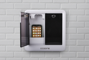델피노에 따르면 씨씨존201은 스마트폰 2대를 충전하며 동시에 살균하는 기능을 갖췄다. 벽걸이 방식으로 공간을 절약하며 깔끔한 디자인으로 인테리어에도 도움이 된다. 2개 동시 모델로 소규모 매장에서도 서비스용으로 사용하기에 적절하다.