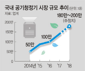 공기청정기 시장은 최근 4년간 연평균 40% 이상 성장률을 기록하고 있다. 올해도 예년 수준 이상 성장률을 웃돌면서 시장 규모가 최소 180만 대에서 최대 200만 대 이상 커질 것으로 관측됐다. 이 경우 판매액 기준으로는 2조 원대에 진입할 것으로 예측됐다.