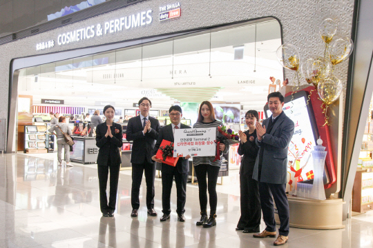 고선건(왼쪽 세 번째) 신라면세점 인천공항점장(상무)은 18일 오전 인천국제공항 제2터미널 화장품·향수 매장 개점을 기념해 첫 구매 고객에게 꽃다발과 선물을 증정했다. 신라면세점은 약 2100㎡ 매장에 110여 개의 화장품·향수 브랜드를 선보인다.