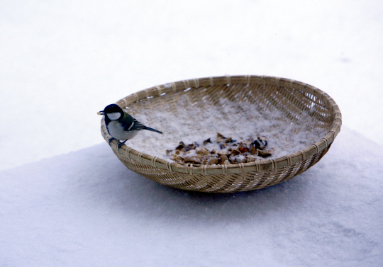 눈 덮인 마당에 소쿠리 하나 놓여 있습니다.
