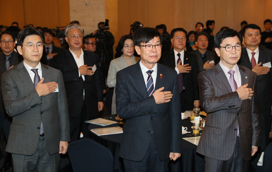 19일 오전 서울 서초구 쉐라톤 팔래스 강남호텔에서 여의도정책포럼과 한국프랜차이즈산업협회 공동 주최로 열린 조찬 강연회에서 김상조(가운데) 공정거래위원장, 박기영 한국프랜차이즈산업협회장(왼쪽), 유종근 한국경제사회연구소 이사장(오른쪽) 등 참석자들과 국기에 대한 경례를 하고 있다. 연합뉴스