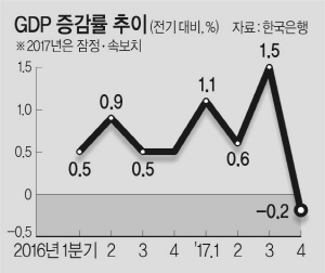 지난해 실질 국내총생산(GDP)이 3%대 성장을 달성했으면서도, 4분기엔 금융위기 직후인 2008년 4분기 이후 9년 만에 처음으로 마이너스 성장(-0.2%)을 한 것이 불안한 ‘성장의 그림자’를 드리우고 있다.