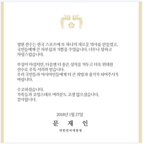 그러면서 “부상이 아쉽지만, 다음엔 더 좋은 성적을 거두고 더욱 위대한 선수로 우뚝 서리라 믿는다”며 “우리 국민과 아시아인들에게 더 큰 희망과 용기가 되어 주기 바란다”고 당부했다.