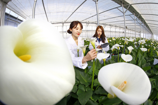 입춘을 사흘 앞둔 1일 전북 완주군 농촌진흥청 국립원예특작과학원 화훼 온실에서 연구원들이 활짝 핀 꽃을 살펴보고 있다.