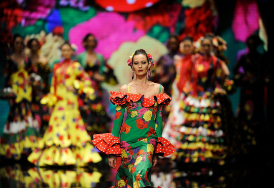 1일(현지시간) 스페인 세비야에서 열린 ‘2018국제 플라멩코 패션 박람회(SIMOF 2018)’에서 모델이 패션 브랜드 필라르 베라의 작품을 선보이고 있다.