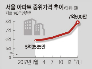 서울 아파트 매매량이 급증하면서 가격도 급등했다. 이날 국민은행이 발표한 월간주택가격에 따르면 1월 서울 아파트 중위가격은 지난해 말(6억8500만 원) 대비 3%(2000만 원)가 올라 7억500만 원을 기록했다. 관련 조사가 진행된 2008년 12월 이후 중위가격이 7억 원을 넘어선 것은 이번이 처음이다.