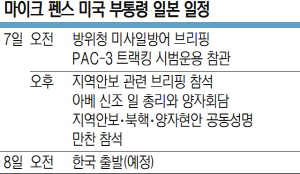 7일 일본을 방문 중인 펜스 부통령은 이날 도쿄(東京)에서 MD 및 지역안보 브리핑 등 안보 일정을 줄줄이 소화했다. 이날 오후 아베 신조(安倍晋三) 일본 총리와의 회담 및 만찬에서도 ‘최대의 압박’ 대북정책 필요성을 제기하고, 공동성명에서도 언급할 것으로 알려졌다. 공동성명에는 미·일 간 MD 증강을 위한 구체적 방안이 담길 것이라는 관측도 제기되고 있다. 이는 9일 평창올림픽 개막식에 앞서 북한에 대한 압박 분위기를 극대화하는 효과를 노린 것으로 풀이된다. 헤더 나워트 미 국무부 대변인이 이날 브리핑에서 “북한이 핵·미사일에 대한 야망을 버려야만 우리는 대화를 나눌 수 있을 것”이라고 밝힌 것과도 맥을 같이한다.