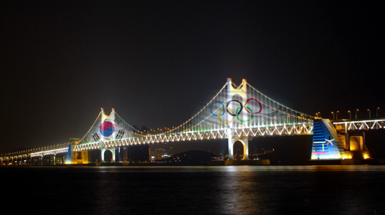 부산의 랜드마크인 광안대교가 평창동계올림픽을 응원하는 빛 조형물로 물든다. 한국마사회, 부산시설공단, 동서대는 평창동계올림픽 국가대표 선수단과 20·30세대를 응원하는 희망 메시지를 담은 ‘미디어파사드’(사진)를 부산 광안대교에 설치했다고 8일 밝혔다. 7000여 개의 발광다이오드(LED) 조명으로 이뤄진 미디어파사드는 올림픽 기간인 9일부터 23일까지 하루 2차례씩(오후 8·9시, 각 10분) 펼쳐져 광안리 밤바다를 아름답게 수놓는다. ‘2018 평창올림픽을 응원합니다’라는 문구와 태극기 및 올림픽 오륜기는 물론 설 명절을 맞아 새해 희망을 기원하는 메시지 등이 등장할 예정이다.