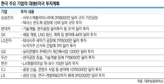 한국수출입은행 통계에 따르면 지난 5년간 한국 기업의 미국 투자는 반기 기준으로 평균 20억~30억 달러 수준이었다. 미국 경제가 살아나면서 지난해 3분기까지 131억100만 달러로, 2016년 전체 투자액보다 많았다. 대한상공회의소 조사에 따르면 국내 주요 기업들의 향후 5년간 대미 투자 규모는 20조 원(약 173억 달러)에 육박할 전망이다.