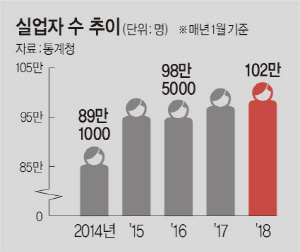 통계청이 14일 내놓은 ‘고용동향’(2018년 1월)을 보면, 올 1월 실업자는 102만 명으로 1월 기준으로 2010년(121만8000명) 이후 가장 많았다. 체감 실업률을 보여주는 고용보조지표3도 11.8%를 기록하면서 1월 기준으로 가장 높았고, 통계 작성 이후 최고치인 12.2%(2016년 2월과 2017년 2월)에 근접했다. 현 추세가 이어지면 올 2월 고용보조지표3이 사상 최고치를 경신할 가능성을 배제할 수 없다는 뜻이다.