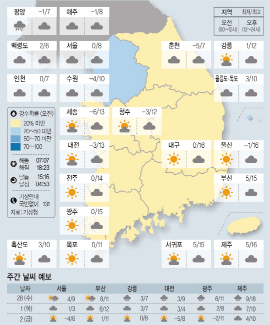 경기 북부내륙과 강원 영서북부에는 오후 한때 비(강수량 5㎜ 미만)가 오겠다. 아침 최저기온은 영하 7도에서 영상 5도, 낮 최고기온은 영상 6도에서 16도가 되겠다.