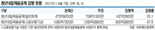 청년내일채움공제 집행률이 떨어지는 것은 무리하게 예산을 늘렸기 때문이다. 이 사업은 2016년 청년인턴제 사업에서 시범적으로 추진돼 예산이 배정되지 않았다. 그러나 2017년 본예산에서는 475억9200만 원이 편성됐으며, 추경에서 709억1500만 원으로 늘어났다. 그 뒤 올해 본예산에는 지난해 추경 대비 214.4%(정부 안 기준) 늘어난 2229억8800만 원이나 편성됐다. 이런 상황에서 올해 청년 일자리 추경이 편성되면 청년내일채움공제 예산은 또다시 급증할 가능성이 큰 것으로 전망된다.