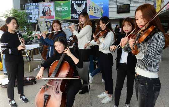 6일 서울 서대문구 대현동 이화여대에서 새 학기를 맞아 신입생 모집활동에 나선 아마추어 오케스트라반 학생들이 즉석 연주회를 열고 있다.