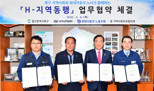 현대자동차 노사가 6일 울산 북구청과 ‘H-지역 동행’ 업무협약(MOU)을 체결(사진)하고, 울산공장 인근 주민을 대상으로 지역밀착형 사회공헌활동에 나섰다. ‘H-지역 동행’ 협약은 현대차 9개 사업부 봉사단과 울산 북구지역 내 8개 동(洞) 지역사회보장협의체가 결연을 하고, 지역 내 다양한 복지이슈 해결로 주민들의 삶의 질을 올리기 위해 마련한 것이다.