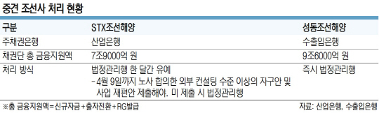 정부는 8일 성동조선해양은 ‘즉시 법정관리’ 돌입을, STX조선해양은 ‘조건부 법정관리’를 결정했다. 정부는 “두 회사 모두 정상화가 불확실하지만, 독자 생존 가능성에 차이가 있고 한꺼번에 정리될 경우 협력업체의 위기 가중 등 조선업 생태계가 붕괴할 우려가 있다”며 선별적 결정을 내린 이유를 밝혔다.
