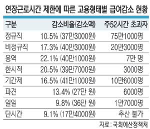 9일 국회예산정책처의 ‘연장근로시간 제한의 임금 및 고용에 대한 효과 분석’ 보고서에 따르면 기존 근로자들은 초과근로시간의 감소에 따라 월 임금이 평균 11.5%(37만 7000원) 감소하는 것으로 나타났다.