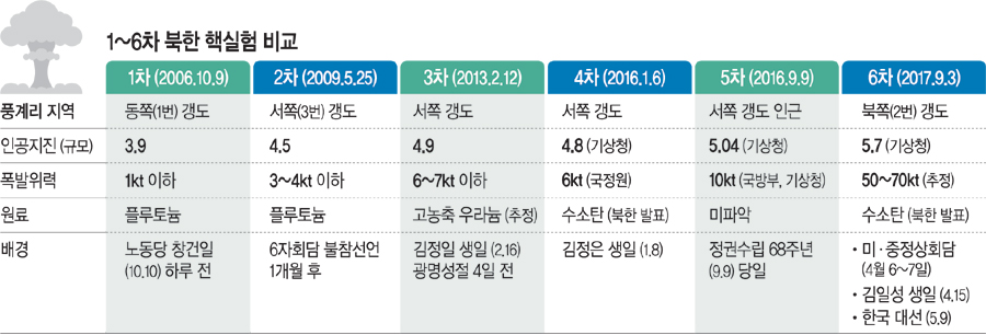 ◇수소폭탄까지 진전된 핵=북한은 2006년 1차 핵실험 후 2016년 1월 ‘시험용 수소탄’으로 제4차 핵실험을 실시했다고 발표했다. 2017년 9월 3일에는 ‘ICBM 장착용 수소폭탄’을 갖고 제6차 핵실험을 했다고 밝혔다. 이는 태평양 전쟁 당시 미국이 히로시마(廣島)에 투하한 원자폭탄보다 약 10배 이상의 위력을 갖는 것으로 평가된다. 제프리 루이스 미 비확산센터(CNS) 소장은 “북한이 핵탄두를 직경 60㎝, 무게 200∼300㎏ 정도로 소형화했을 가능성이 있다”고 평가했다. 권용수 전 국방대 교수는 “핵 소형화에 대한 평가는 북한이 ICBM에 탑재 가능한 초기 수준의 능력을 갖춘 것으로 보인다”고 말했다. 북한은 개발한 수소폭탄에 대해 “거대한 살상 파괴력을 발휘할 뿐 아니라 전략적 목적에 따라 고공에서 폭발시켜 광대한 지역에 초강력 핵 전자기파(EMP) 공격까지 가할 수 있는 다기능화된 열핵전투부”라고 주장했다.