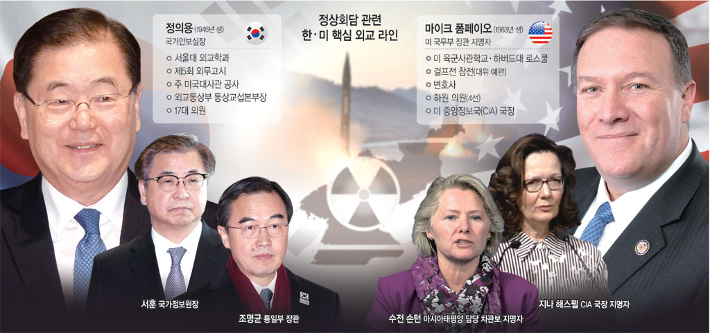 미국이 마이크 폼페이오(현 중앙정보국(CIA) 국장) 국무장관 지명자를 필두로 외교·안보 라인을 재정비하면서 정의용 국가안보실장을 중심으로 한 한국 외교·안보 라인과의 대북 정책 공조가 원활하게 이뤄질지 주목된다. 대화파로 분류되는 정 실장과 강경파로 평가받는 폼페이오 지명자가 이인삼각의 대북 강온 전략을 구사하느냐, 엇박자를 내느냐에 따라 남북, 미·북 정상회담의 성패가 갈릴 수 있다는 분석이 나온다.