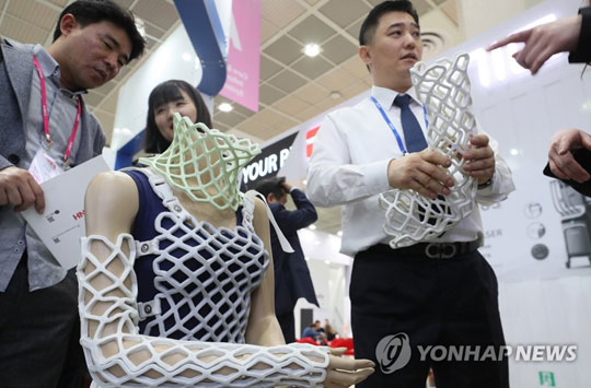 15일 오후 서울 강남구 코엑스에서 열린 제34회 국제의료기기·병원설비 전시회에서 오픈엠 직원이 관람객에게 오픈캐스트(개방형 깁스)를 설명하고 있다.