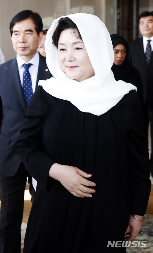 베트남에 이어 UAE를 공식 방문하는 문재인 대통령의 부인 김정숙 여사가 24일 오후 아랍에미리트연합(UAE) 아부다비왕실공항에 도착, 머리에 히잡을 두르고 환담장으로 이동하고 있다.