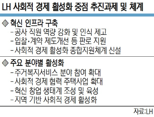 LH(한국토지주택공사)가 혁신 인프라 구축과 주요 사업 분야별 지원을 통해 사회적 경제 활성화에 본격 나선다. LH는 26일 ‘사회적 경제 조직과의 혁신적 동행’을 주제로 하는 ‘LH 사회적 경제 활성화 방안’을 본격 추진한다고 22일 밝혔다.