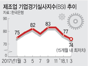 한국은행이 29일 발표한 3월 기업경기 실사지수(BSI)에 따르면, 제조업 업황 BSI는 74로 한 달 전보다 1포인트 떨어지면서 15개월 만에 최저치를 기록했다. BSI는 기업이 인식하는 경기 상황을 보여주는 지표다. BSI가 100을 밑돌면 경기를 비관적으로 보는 기업이 좋게 인식하는 기업보다 많다는 의미다.