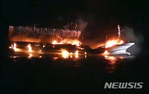 A호는 출동한 해경 함정이 소화 작업 중에 있으나 거의 불에 탄 것으로 파악됐다.