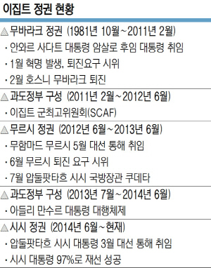 국방장관 출신인 시시 대통령은 지난 2013년 심각한 사회·정치적 혼란으로 퇴진 요구가 거셌던 무르시 전 대통령을 축출하고 이듬해인 2014년 대선을 통해 97%의 득표율로 대통령에 취임했다. 2011년 튀니지에서 시작한 ‘재스민 혁명’의 물결이 이집트의 ‘1월 혁명’으로 이어지면서 무하마드 호스니 무바라크 전 대통령이 물러난 뒤 무르시 전 대통령이 기대 속에 취임했지만 국민은 무르시 정권하에서 혼란이 심각하다며 퇴진을 요구했다. 시시 당시 국방장관은 이 같은 요구를 등에 업고 사실상 ‘쿠데타’를 통해 정권을 획득했다.
