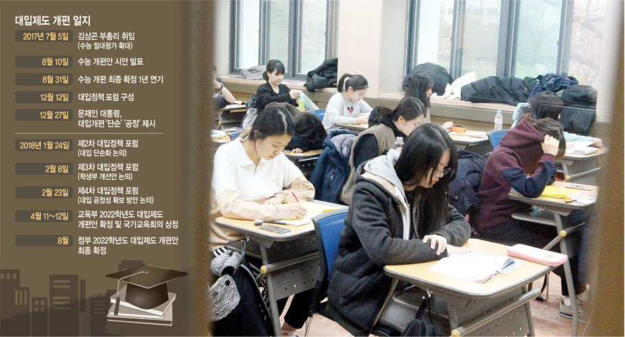 이런 혼란을 충분히 예상할 수 있었던 교육부가 그럼에도 대학들을 압박한 것을 두고 ‘윗선’의 지시에 따른 불가피한 선택이었을 것이라는 의구심이 제기되는 것이다. 그동안 학생부종합전형 폐지와 정시모집을 확대해 달라는 여론이 청와대와 여당을 괴롭혀 왔다. 그러나 정시모집 확대만이 대입의 공정성을 확보할 수 있는 대안인가에 대해서도 논란이 될 수 있다. 수시와 정시를 아예 통합해 버릴 경우 수시·정시 모집 비율을 신경 쓸 필요가 없게 된다. 교육부가 통합 방안을 검토하는 이유이기도 하다.