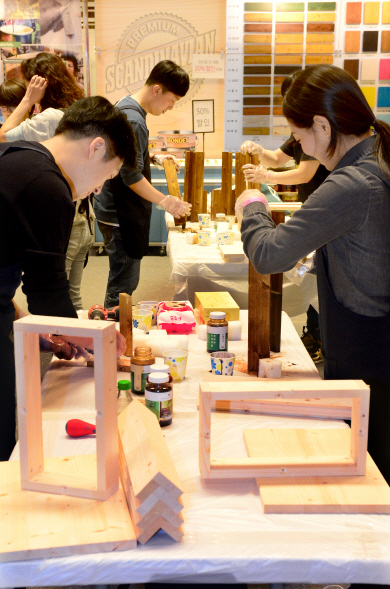 서울 강남구 삼성동 코엑스에서 5일 열린 ‘2018 ‘DIY리폼박람회’의 한 업체 전시장에서 시민들이 DIY가구 만들기 체험을 하고 있다. 박람회는 8일까지 진행한다.
