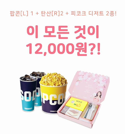 피코크 콤보세트는 피코크 티라미수 케이크(150g), 피코크 펑리수(120g), 팝콘 라지 사이즈, 탄산음료 레귤러 사이즈 2잔으로 구성했으며, 가격은 1만2000원이다.