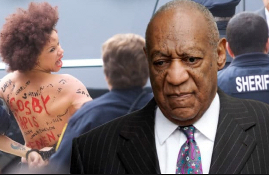 한편 이날 법원 앞에서는 토플리스 차림의 여성이 건물로 들어가는 코스비를 향해 돌진하다 보안관에게 연행되기도 했다.(사진) 이 여성은 빌 코스비의 대표작 ‘코스비쇼’에 여러 차례 아역으로 출연했던 니콜 로셸로 밝혀졌다. 페미니스트 단체인 ‘페멘’ 회원인 로셸은 “코스비로부터 당한 여성들의 불편한 심정을 코스비가 그대로 느끼게 하려고 시위를 계획했다”고 말했다.