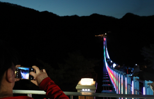 12일 야간개장한 강원 원주시 소금산 출렁다리를 찾은 한 시민이 휴대전화로 다리를 촬영하고 있다. 출렁다리는 개통 89일 만에 관광객 70만 명을 돌파하는 등 연일 관광객들로 북적이고 있다.